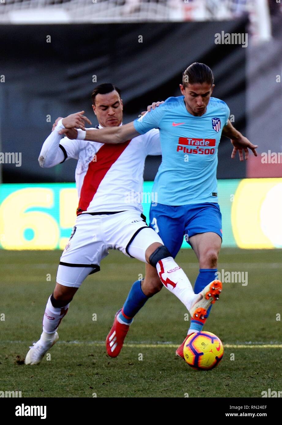 Madrid Spain 16th Feb 2019 Rayo Vallecano S Raul De Tomas L Vies With Atletico Madrid S Filipe Luis During A Spanish La Liga Match Between Atletico Madrid And Rayo Vallecano In Madrid Spain